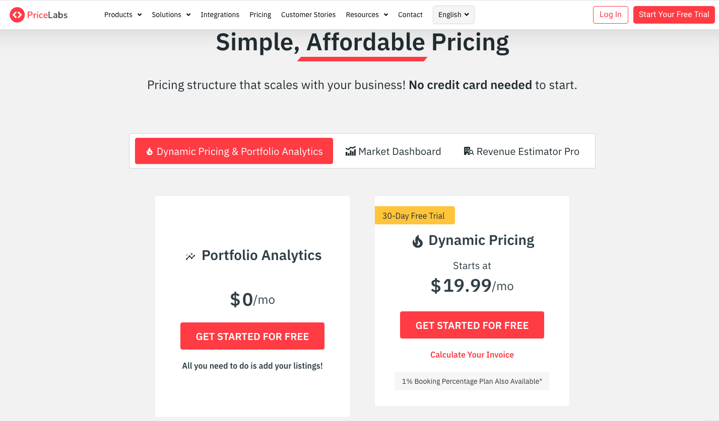 PriceLabs offers a 30-day free trial and subscription plans start at $19.99/month for a single listing, with pricing increasing for additional listings. It also offers the option to charge 1% of revenue for those who refer with a variable pricing plan.